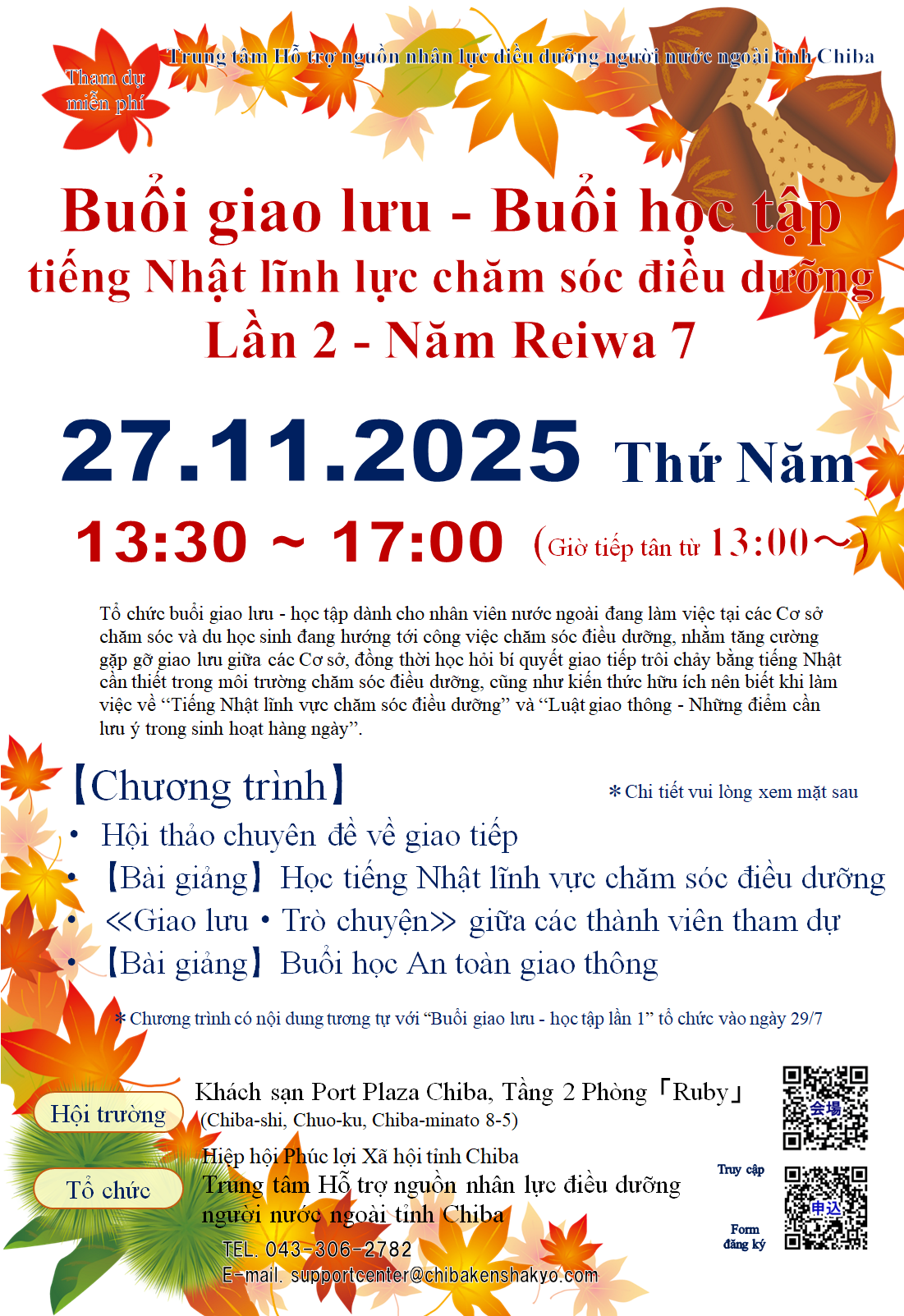 Tổ chức buổi giao lưu - học tập dành cho nhân viên nước ngoài đang làm việc tại các Cơ sở chăm sóc và du học sinh đang hướng tới công việc chăm sóc điều dưỡng, nhằm tăng cường gặp gỡ giao lưu giữa các Cơ sở, đồng thời học hỏi bí quyết giao tiếp trôi chảy bằng tiếng Nhật cần thiết trong môi trường chăm sóc điều dưỡng, cũng như kiến thức hữu ích nên biết khi làm việc về “Tiếng Nhật lĩnh vực chăm sóc điều dưỡng” và “Luật giao thông - Những điểm cần lưu ý trong sinh hoạt hàng ngày”.