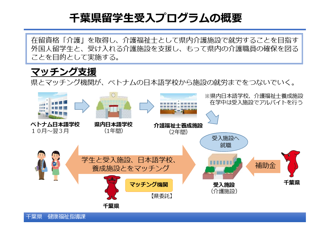 千葉県では、介護人材の定着・確保が厳しい状況を踏まえ、外国人介護人材の受入促進のため、留学生(候補者)が安心して入国し、千葉県で働けるよう、留学生(候補者)と現地日本語学校、県内日本語学校、介護福祉士養成施設、受入先となる介護施設のマッチングを行っています。